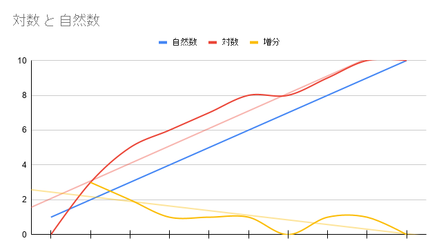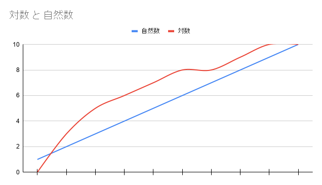 自然数が「2」の時にすでに対数は「3」ですみたいな感じ。